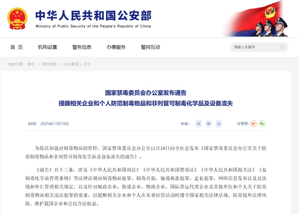 为依法加强制毒物质监管,国家禁毒委办公室于11月10日向全社会发布《国家禁毒委办公室关于防止制毒物品和未列名制毒化学品、设备丢失的通知》。《通知》共13条,涉及《中华人民共和国刑法》、《中华人民共和国禁毒法》等法律法规。中华民国海关法、化学易制毒管理条例以及其他有关毒品犯罪、案件毒品生产、逃税犯罪、网络犯罪、信息泄露、反垄断等法律法规洗钱及相关管理规定。该规定以及邮政企业、快递企业、物流企业、国际货运代理企业等单位和个人防范制剂违法犯罪的要求,提醒相关企业和个人在从事经营活动中遵守国家有关法律法规,规避境外法律风险,维护我国企业和公民的合法权益。国家禁毒委员会办公室关于进一步规范制毒物质及非管制制毒化学品生产、经营、运输和进出口活动的通知根据《中华人民共和国广告法》、《中华民国出口法》、《中华人民共和国税收管理法》、《易制毒化学品管理条例》、《危险化学品安全管理条例》、《中华人民共和国外汇管理条例》等法律法规,现将有关事项公告如下: 一、根据《中华民国刑法》规定,严禁任何组织或者个人非法交换、任何人交换用于制造药品的醋酸酐、乙醚、氯仿或者其他用于制造毒品的原料和制剂,或者携带上述物品为知道自己正在制造毒品的其他人生产和运输上一段中指定的物品。未列入列入清单制造药品,但仍为其制造、运输或出口非列入列入清单的药品的化学品和设备。不属于管制的可用于制造药品的化学品和设备,必须依法履行纳税义务,避开国家禁止、限制进出境的管理,运输、携带、邮寄国家禁止、限制的货物、物品或者依法应税的货物、物品进出境的,属于走私行为。海关将没收走私货物、物品及其违法所得,并可以处以罚款。构成犯罪的,依法追究刑事责任。进出口货物、物品或者过境、转运货物不实申报的o 海关,可能会处以罚款。有违法所得的,没收违法所得。 5、根据《中华人民共和国网络安全法》,网络运营者必须加强对其用户发布的信息的管理。发现法律、行政法规禁止发布、传输的信息的,必须立即停止传输信息,采取清除等处置措施,防止信息扩散,保存相关记录,并向有关主管部门报告。六、根据《中华人民共和国刑法》、《中华人民共和国反洗钱法》、《人民外汇管理法》等有关规定,由有关主管部门依法给予行政处罚。构成犯罪的,依法追究刑事责任与法律共舞。七、鼓励生产、销售、运输、进出口未列名有毒化学品及设备的单位建立健全内部管理制度,保存相关记录和相关许可证件或证明文件副本,特别是严格审查境外采购商资质,严防以“大额订单”、“样品检测”为名进行非法交易。如您发现下游买家要求改变可用于生产药品的化学品的品名、包装、运输方式等,可能有被用于非法用途的线索,或发现有虚假发票、虚报信息等违法犯罪嫌疑的,请立即停止交易,依法向当地公安机关或有关主管部门举报,并配合事实调查,以免被骗。参与违法犯罪活动。八、在互联网上发布非药品类易制毒化学品销售信息的单位,必须具备工商营业执照、非药品类易制毒化学品生产经营许可证或者登记证等资质材料;禁止个人在互联网上发布非药品化学品易制毒销售信息。禁止任何单位和个人在互联网上发布医药化学品广告信息。任何单位和个人在互联网、社交媒体、电商平台等渠道发布非法制毒化学品及设备销售信息时,必须实名注册,并遵守相关法律法规。严禁发布违法信息。通过境外平台发布此类信息时,您还必须遵守国家相关法律、法规。九、请有关单位和个人增强法律意识。出口既具有合法用途又可用于制毒的非表列产毒化学品和设备时,必须关注国际公约和相关进口国的法律法规,特别是美国、加拿大、墨西哥等高风险国家。要求境外客户按照本国法律法规办理合法进口手续,避免法律风险。十、请有关单位和个人增强风险意识。他们知道,一些不受管制的可用于制造药品的化学品和设备受到相关国家的管制,不符合进口国的相关法律法规。那些需要在该国进行销售、运输或出口的人可能会面临刑事指控或处罚m 该国的执法当局。十一、邮政公司、快递公司、物流公司发现以隐匿、虚假品名等方式在境内外非法邮寄、运输化学易制毒原料及其他药用原料或制剂的,必须立即依法向公安、海关报告,并配合公安、海关调查。邮政企业、快递企业、物流企业可如实记录或维护上述信息。十二、国际货运代理企业必须真实申报货物名称和用途,与走私分子合谋为走私不列颠化学品或可用于生产毒品的设备提供运输、储存、邮寄或者其他便利的,依法追究责任。十三、有关单位和个人如遇到外国执法机构非法行使职权,可以采取一切合法手段维护自身安全和合法权益,并向中国驻外使领馆寻求协助。此处发出通知。网站截图