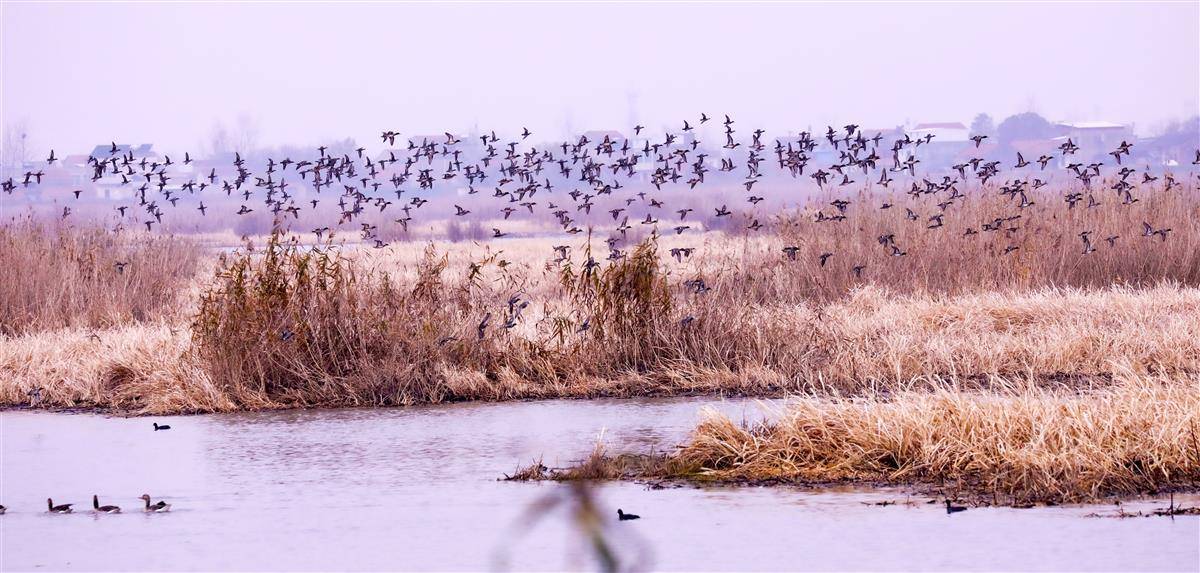 12月22日,湖北老观湖国家湿地公园芦苇摇曳,碧波怒吼。数以万计的白天鹅、老鹰等候鸟在这里嬉戏、飞翔,构成了一幅人与自然和谐共处的画卷。作为江汉平原原生态湿地的明珠,当地以三级树塘系统构筑起坚固的防护屏障,修湖为湖、治理污染、保护植被,使湿地成为珍禽的天堂,充分展现了生态文明建设的成效。 (郑毅、王小平 摄)